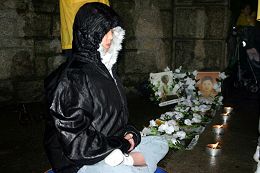 最后法轮功学员赵明表示:“今天天气一直都不好,一直都在下雨,但是我们的蜡烛并没有熄灭。在这八年迫害中,法轮大法也像这蜡烛一样,在风雨中没有灭,没有倒下。可是,中共邪党却在它发动的对‘真善忍’的迫害中在走向解体,走向灭亡。”