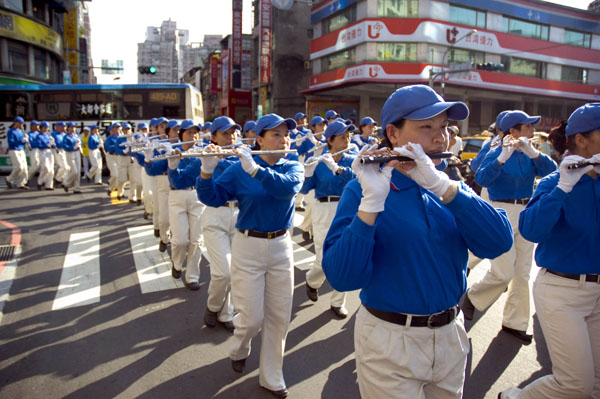 ![]() 阵容庞大的天国乐团,吹奏着「法轮大法好」,吸引行经的路人、汽机车骑士驻足围观 |