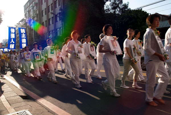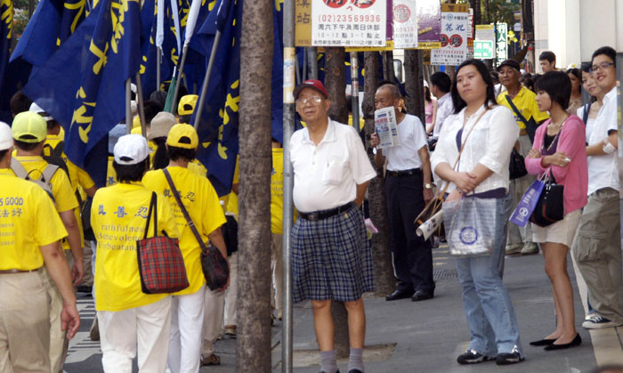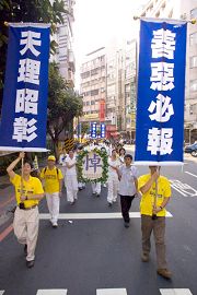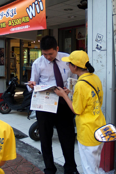 一位台湾某大报的记者刚好家住在永和,他出门碰上了法轮功游行队伍,向学员了解今天的游行主题,并说他知道这场惨绝人寰的迫害,他会将法轮功事件贴在自己的部落格里给网路的朋友观看,让他们了解真相。