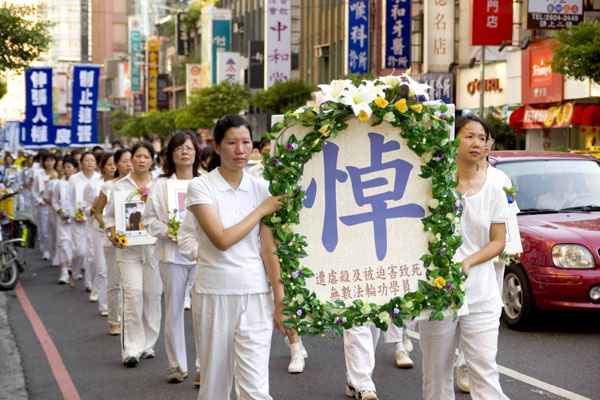 二零零七年七月二十一日下午,台北的法轮功学员顶着摄氏三十八点六度的艳阳,在永和地区举办了一场千人游行活动,队伍所到之处引起民众驻足关注,支持「呼唤良知、停止迫害」的诉求。