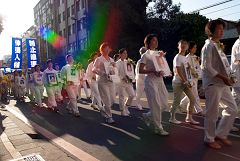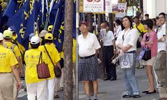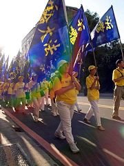陈女士说今天带了五百多份材料出门,游行还未走完,她已发了四百多份了,百分之九十九的人都会接下材料,显示民众对法轮功受迫害的真相有一定的了解。