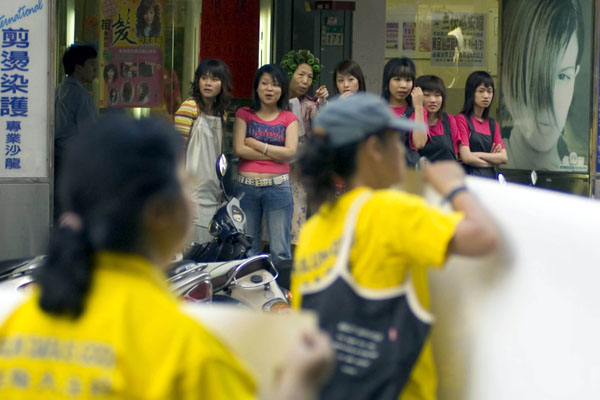 ![]() 在烫发的女士与数名美发师走出店门观看游行 |