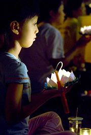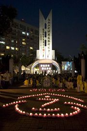 晚间六点五十分,一千六百多名法轮功学员涌入台北中和八二三纪念公园,以音乐和歌声悼念这八年来,在中国大陆遭中共迫害致死的同修。舞台上一首首呼唤正义良知的歌曲将邪恶湮灭,舞台下一盏盏传递真诚善良的烛光把黑暗照亮!学员们盘腿坐在广场上,举起手中的莲花灯,捧着被迫害致死的法轮功学员的照片,静默端坐,庄严圣洁。