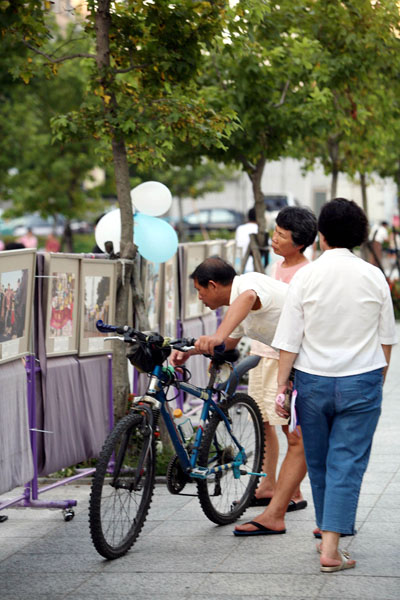 ![]() 一幅幅法轮大法弟子证实法的真实照片,吸引民众驻足仔细观看 |