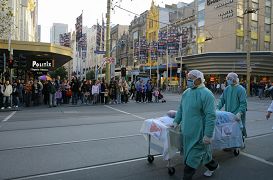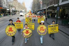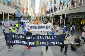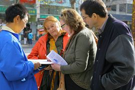 集会后,举行了反迫害游行,行人们对游行队伍展示的法轮功受迫害真相感到震惊,观看的非常仔细,纷纷接受真相传单,并询问详情。