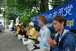 二零零七年七月二十日,荷兰法轮功学员来到中使馆前抗议中共对法轮功学员长达八年的迫害。