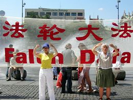二零零七年七月二十一日,法轮功学员在德国慕尼黑市中心举行活动,抗议中共对信仰“真善忍”的法轮功修炼者长达八年的迫害。