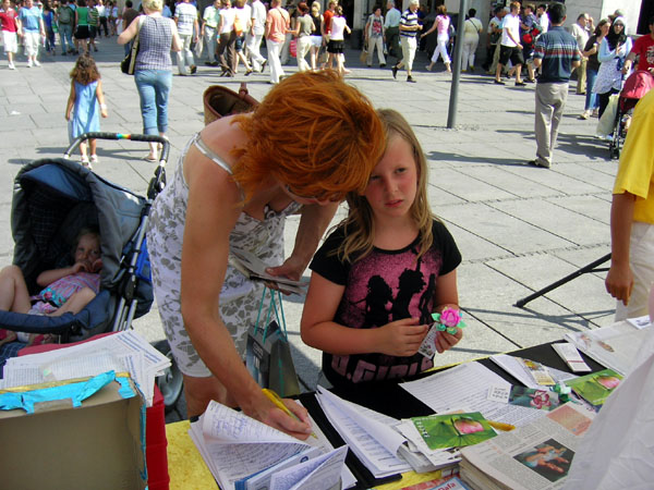 。人们感受到了这群修炼者给世界带来的正气,也看到了共产党的残暴,纷纷签名谴责中共暴行。越来越多的人站在了正义的一边,有的对法轮功学员说:“祝你们好运,我们正义的一边会越来越强大的。”有的说:“(中共)活体摘取人的器官,这不是人的行为。”