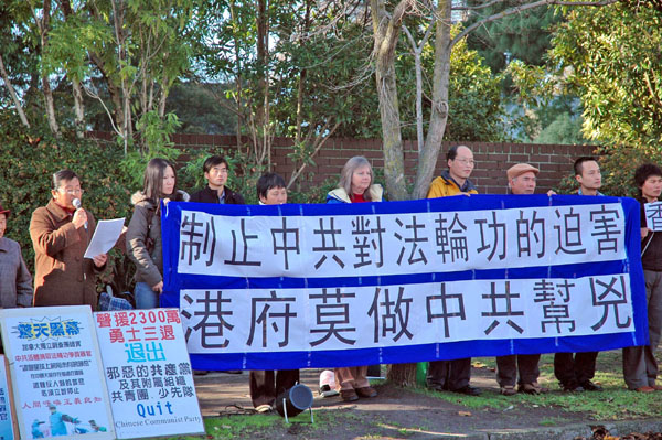 维省法轮大法学会发言人分别用中英文宣读了抗议声明,声明表示,七一香港主权移交十周年,港府据报根据中共提供的黑名单严密限制到港参加游行的海外法轮功学员入境,并非法遣返法轮功学员,至二零零七年七月一日,遭到遣返、拒绝登机、拒发港签的台湾法轮功学员总数已接近千名,被遣返的法轮功学员来自包括台湾、澳洲、菲律宾及澳门等地,酿成自香港主权移交以来遣返规模最大、过程最暴力的人权事件。