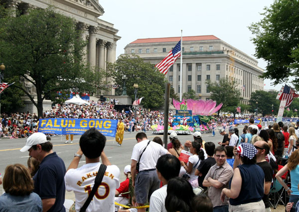 在观看游行的观众中也有不少华人面孔,一位在中国国务院工作的政府官员到美国来作短期访问,就碰巧在这个游行中看到了法轮功学员。他说自己几年前去英国的时候,就特地上网络上下载了《转法轮》一书,并要求自己不带任何观念的看看这书里讲了什么,结果发现和中共的宣传大相径庭,而且都是教人向善的。他觉的只要不影响别人,又教人向善,就不应该被打压。他说自己在国内的工作单位的传真机上经常能收到《九评共产党》的信息。