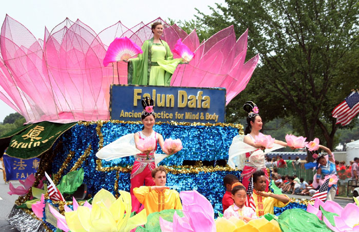 ![]() 精美的花车撒播着法轮大法的福音 |