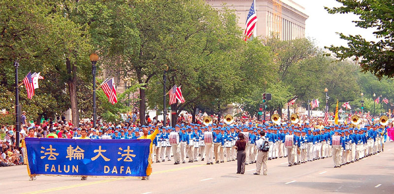 花车后面就是由近两百多名法轮功学员组成的“天国乐团”军乐队,整个乐团成八路纵队,横贯整个宪法大道,声势浩荡。天国乐团演奏了《法轮大法好》、《法鼓法号震十方》、《法正乾坤》、《美丽的美利坚》和《送宝》五首乐曲。有许多观众随着天国乐团的鼓点击掌、摇摆、喝彩。