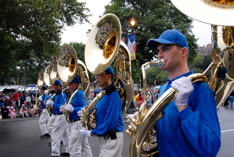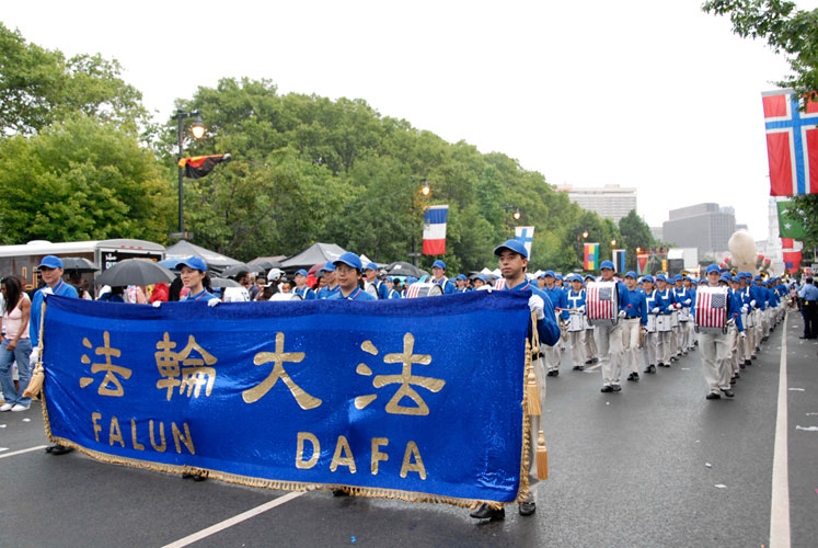 七月四日的独立节游行在傍晚六时半准时开始,夏日的费城的天气出奇的凉爽,几十万来自世界各地的游客兴致勃勃的聚集在本•弗兰克林大道两旁观看大游行。天国乐团以蓝底金字的中英文横幅“法轮大法”开道,年轻女学员指挥,团员们身着蓝色上衣、米色长裤,尽管当日凌晨就上路了,而且刚从首都华府游行表演结束后赶到费城,仍然个个精神抖擞,“美丽的美利坚”、“法轮大法好”、“法正乾坤”、“送宝”,一首接一首的乐曲,悦耳动听,透着真理和慈悲的力量,吸引了无数观众,也把法轮功学员的真诚祝福带给了热情的观众。
