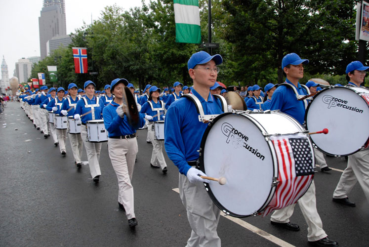 游行进行到一半,原本预告下午的雷雨姗姗来迟,变成了阵阵细雨,有备而来的观众纷纷撑起了伞,法轮功学员不为所动,坚持在雨中为大家演奏,一曲完毕,观众们纷纷鼓掌喝彩。对不少费城地区的西方人来说,法轮功已并不陌生,这是费城法轮功学员第六次参加独立节游行,周末费城自由钟景点的集体炼功已成为路人熟悉的景观。