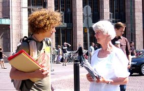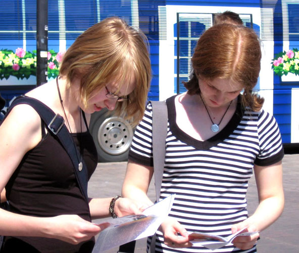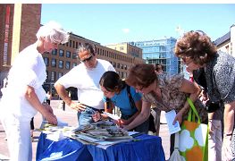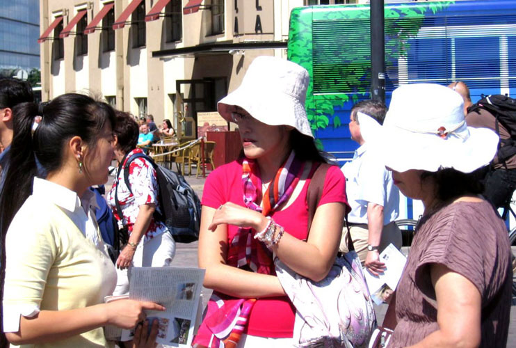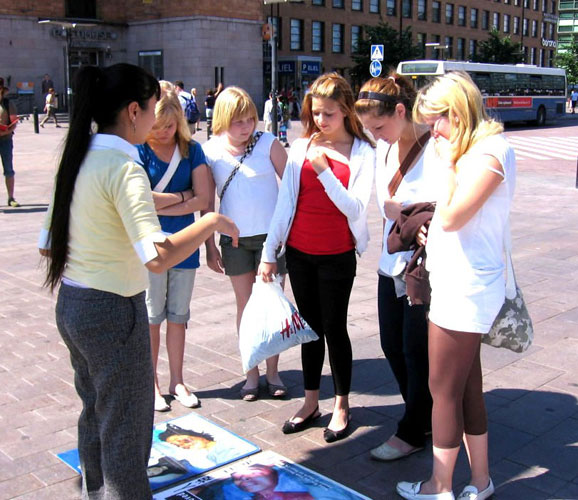 活动中几位日本人、芬兰人和操英语的西方人都提出了一个相同的问题:为什么共产党不喜欢法轮功?义工和学员解释,信奉“假恶暴”的中共恐惧越来越多的人去信“真善忍”,它就无法再操控人们的思想了。义工和学员还推荐人们去阅读《九评共产党》,去了解共产党的邪恶本质,就会从根本上回答疑问。当向他们递上英文“九评”时,每个人都诚恳的道谢,如获至宝。