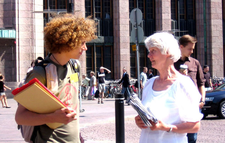 横幅、展板、传单加上芬兰法轮功学员Oli用高音喇叭一遍遍的讲解《九评共产党》内容、揭露中共对法轮功学员持续八年之久的灭绝人性的虐杀罪行,路人无不动容,现场反应十分强烈。
