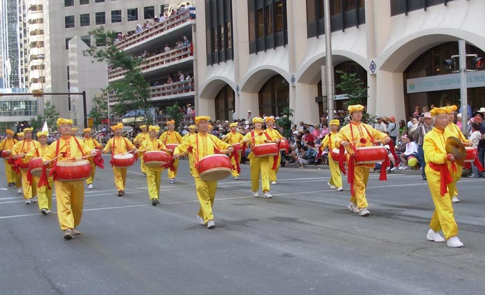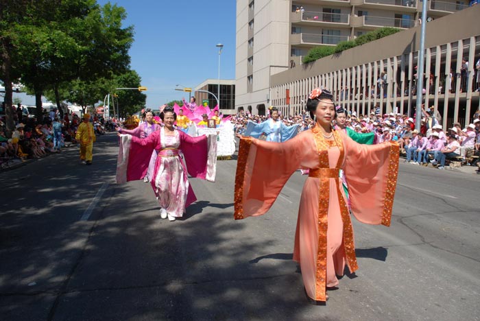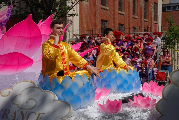 在当天的游行中,法轮大法团队以醒目的巨幅横幅「法轮大法好」开道,紧随其后的仙女和唐装表演,向人们展示了法轮大法的美好,以及中华传统(半神)文化的内涵。之后是最为靓丽的花车,粉红色的巨大莲花花瓣在阳光下散发出祥和的光环,莲花上的仙女向人们徐徐招手祝福,两侧分别坐着两位中西方法轮功学员,平和舒缓的功法演示,令观众群里不时发出阵阵惊叹「so fabulous!(神话般的美丽)」。队伍的最后是阳刚威武的堂鼓方阵,阵阵鼓点,犹如一浪一浪的冲击波,令人间一切不正的东西消失遁形。