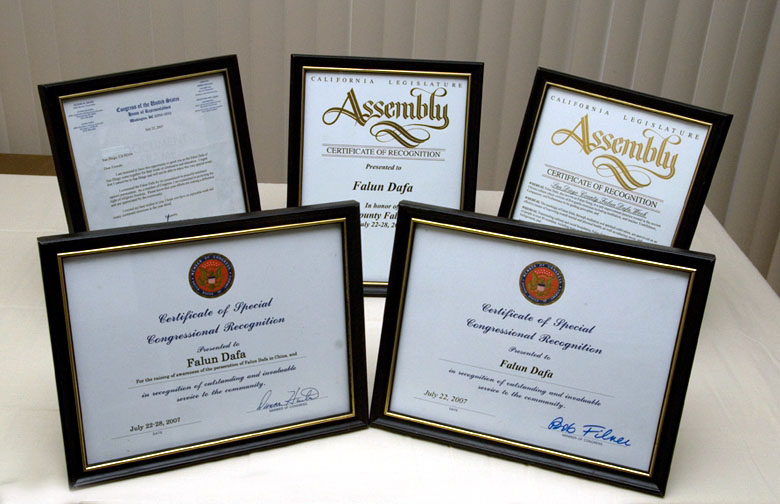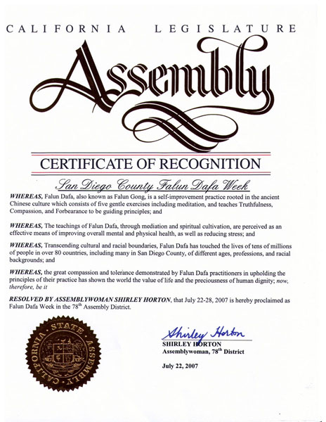 美国国会众议员邓肯•亨特(Duncan Hunter)、鲍勃•费尔纳(Bob Filner)、加州议会议员雪丽•霍顿(Shirley Horton)为大法颁发了嘉奖令。亨特议员特别表彰法轮功学员“让社区了解在中国进行的对法轮功的迫害”。霍顿议员在嘉奖令中说,「法轮大法超越了文化和种族的界限,洪传到八十多个国家的几千万人,……他们来自不同年龄、不同职业和不同的族裔背景」,「法轮大法修炼者在捍卫他们的修炼原则时表现出的大善和大忍,向全世界展示了生命的价值和人类尊严的可贵」。