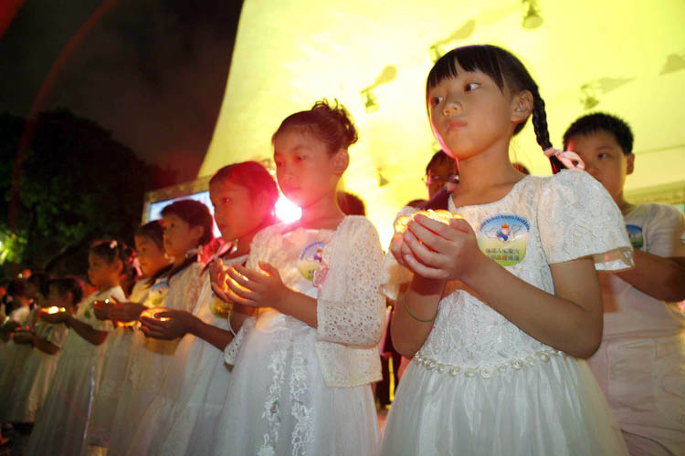 ![]() 响应八月九日人权圣火在雅典点燃,台北于十日晚间举行「人权圣火之夜」,呼吁人们共同努力,早日终止中共的迫害。(图为来宾与三十二位儿童共同传递烛光,代表人权圣火的光明到来) |