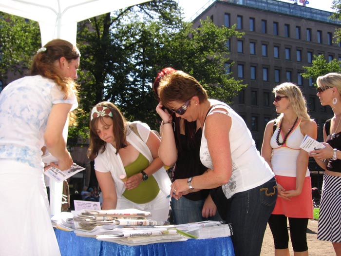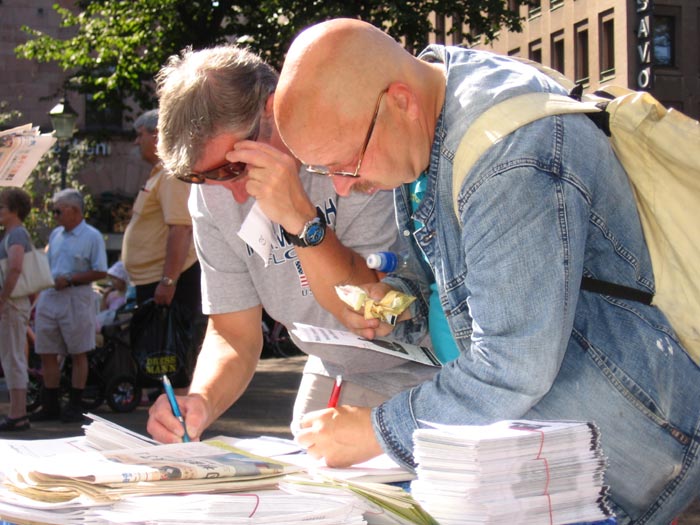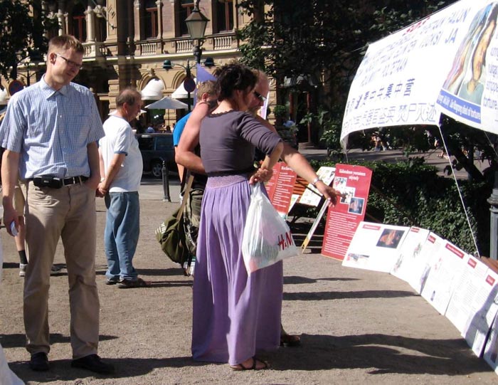 一位芬兰年轻人听了中共八年来对法轮功的迫害,特别是活摘法轮功学员器官的真相后,看到桌面还摆有中文资料,立刻要了《九评共产党》、《解体党文化》和两千万三退(退出中共党、团、队)特刊以及法轮功真相小册子等所有类别的中文资料。因为他的一个中国同事说法轮功不好,他知道这个中国同事说的不对,所以他要请那个同事自己来了解真相。