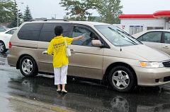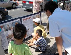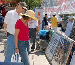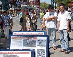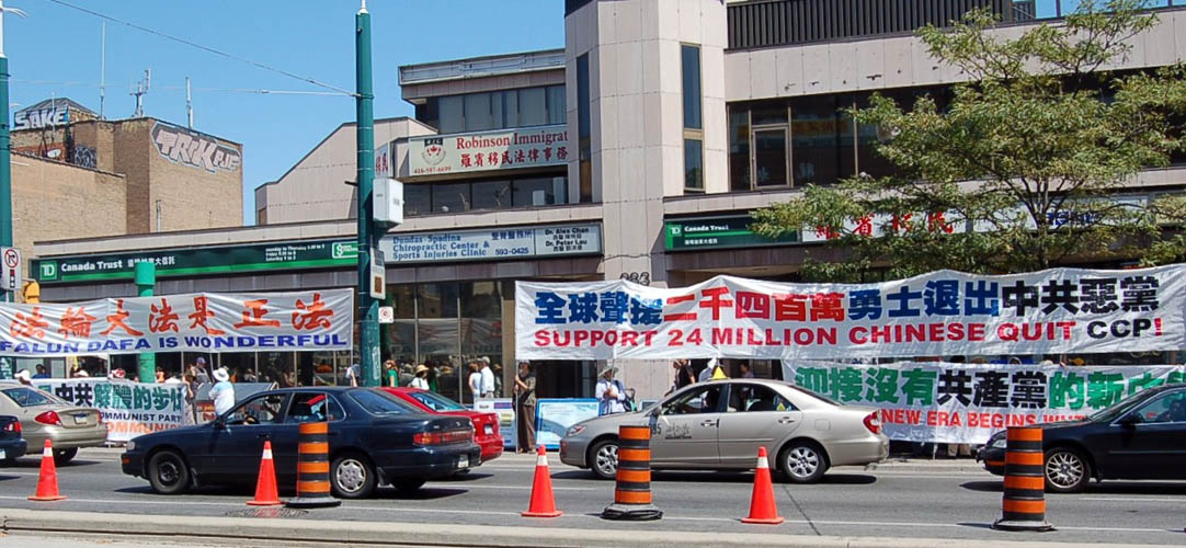 在龙城商场对面的TD银行门前,多伦多的法轮功学员和退党服务中心的义工,拉出三十多米长的大横幅阵,内容有“法轮大法好”、“声援二千四百万勇士退出中共恶党”、“读九评快退党”等。他们摆出揭露中共迫害法轮功学员和恶党建政以来杀害八千万大陆同胞的展板,向来往路人发资料,还有一些法轮功学员静静的打坐炼功,喧嚣与烈日对他们此刻不复存在,那般宁静与祥和感染着过往行人。