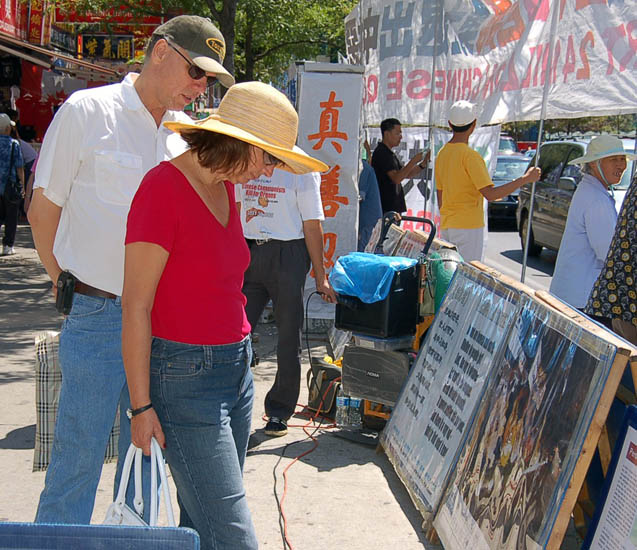 法轮功学员爱丽丝拿着麦克风对着满街游人大声呼唤:“女士们,先生们:冬天我们冒着严寒,今天我们顶着烈日,在这里我们坚持了八年,只是为了告诉你们法轮大法好!天要灭中共,快退出这个邪恶的组织,不要给它当陪葬品,要做华夏儿女,不做马列子孙。欢迎你们来了解法轮功。”