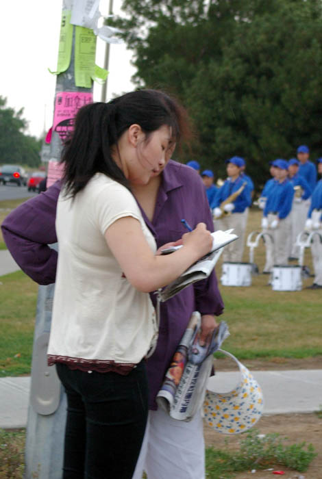 在发真相资料的法轮功学员王女士,正在给一位名叫林静的女青年办理退团和退队的签名。后来王女士介绍说,那位女青年是一位留学生,一个非常善良和纯真的女孩,她说她理解并同情法轮功。与她讲了中共的邪恶后,她马上就签了名声明退团和退队。临走时还把她的电话号码留下了,希望我们以后多与她联系。