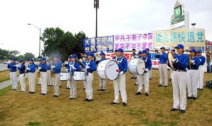 八月十二日中午,士嘉堡区华人聚居的太古广场前的十字路口,多伦多退党服务中心在此举行了声援二千四百多万勇士退出中共的活动。由法轮功学员组成的多伦多天国乐团的部份成员参加了表演,他们对着川流不息的车辆演奏着洪亮的乐曲,沿途的司机有的对着乐队竖起大拇指,有的按喇叭表示支持,在十字路口停车的司机都纷纷伸手来取资料。
