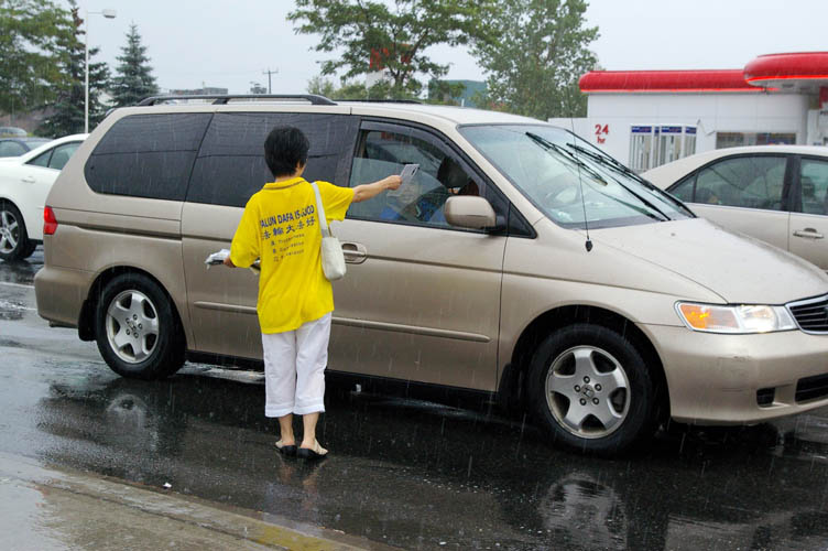 对于在风雨中还在坚持不懈的在演奏,吹萨斯风的乐手金女士表示,一场大雨对于大法弟子来说算不了什么,我们在这风雨中演奏,从人们的反应和表情中,我相信人们能感受到我们的用心。因为那些匆匆而过的人们都回头看我们的横幅,停车的司机都伸手要资料。