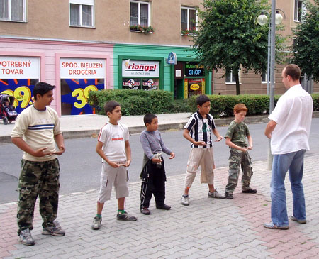 八月十一日星期六,学员前往瑞玛斯卡索博塔 (Rimavska Sobota),已有一些孩子们在那里欢迎法轮功学员。他们已经获悉这场活动,而想要把他们影子的轮廓画在人行道上,作为抗议中共迫害的象征。许多来自匈牙利的游客驻足在真相横幅前,并观看功法演示,很多人在请愿信上签名。