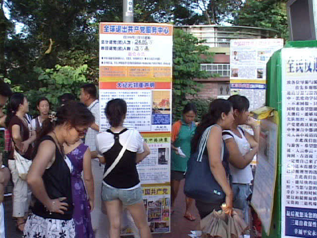 ![]() 香港景点的退党服务中心一角,许多游客仔细的看展板的内容 |