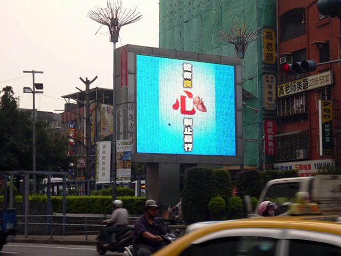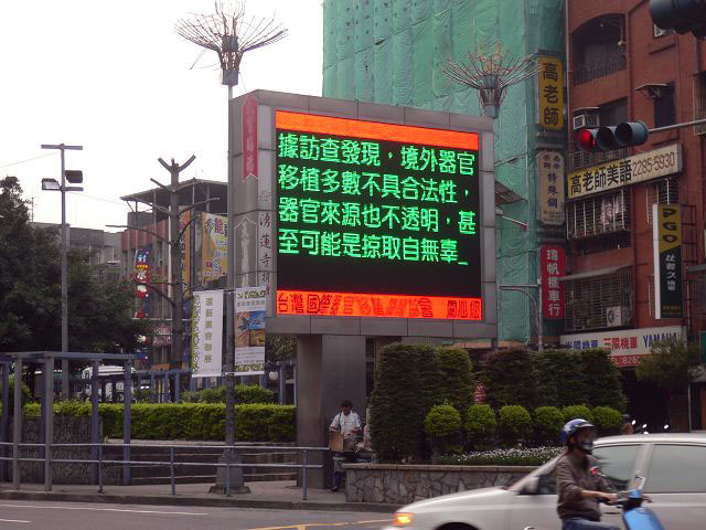 芦洲市三民路跟中山一路、二路的交叉口,有一个全市唯一的电子看板,平常播放地方上的一些活动和市公所对政策的推广。四个月前电子看板增加了让人不得不深入思考的「抢救良心 制止暴行」宣导,内容是提醒市民境外器官移植多数不合法也不透明,前往中国大陆做器官移植要三思而后行。芦洲市民胡先生说,这个路口与三重交接,车流量非常大,从三重要去五股都得经过这个三角地带。