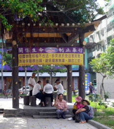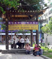 ![]() 芦洲市各里的休闲公园也悬挂「小心境外器官移植风险」的文宣 |