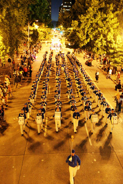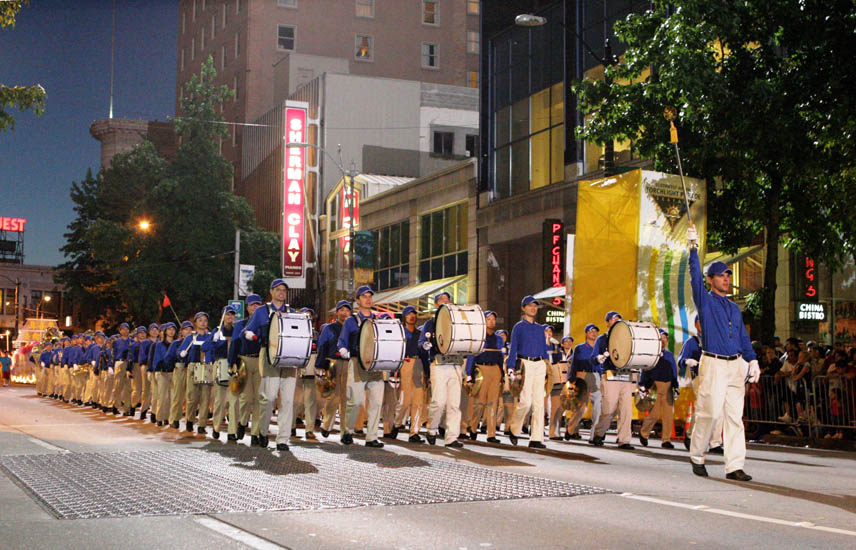 法轮功队伍由天国乐团一百四十人浩浩荡荡开启“由西方通往神奇东方世界”的大门。在西方社会,军乐队尤其在游行表演中盛行,但象天国乐团这么庞大的却不多见。观众大卫曾是华盛顿大学军乐队一员,并参加过海洋节炬光游行。他看到天国乐团的表演时说,“我从来没见过这么大的军乐队!”