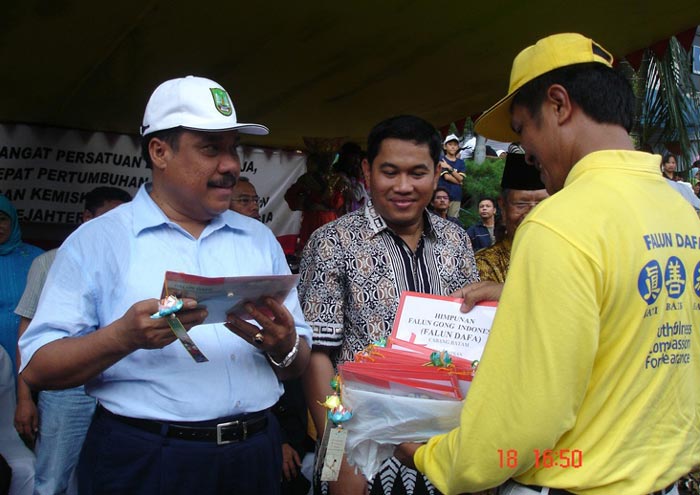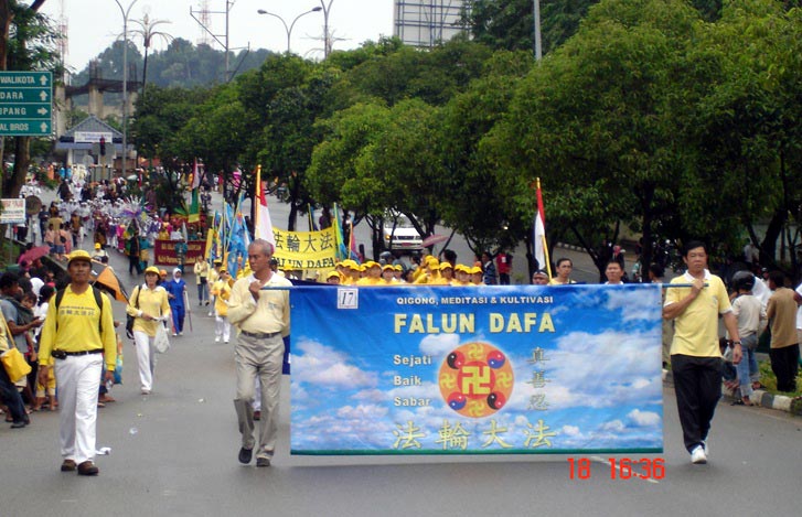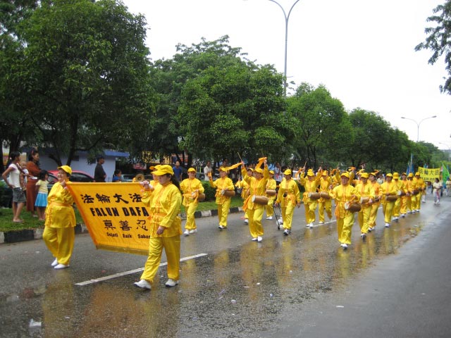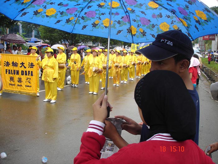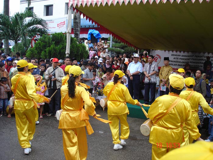 游行队伍行经贵宾台时,腰鼓队停在台前,一位学员将法轮大法真相资料送给市长及官员,腰鼓队随即表演及示范法轮功功法。活动主持人介绍法轮功给贵宾及民众。