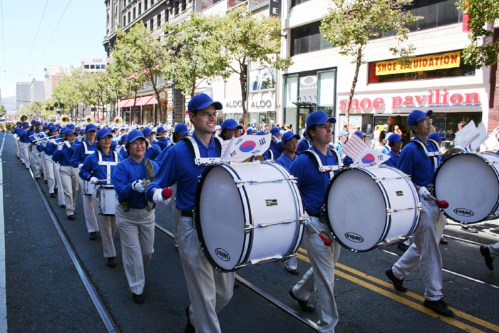 庆祝活动从市政厅出发的游行开始,在游行中,作为首次参加韩国日游行的美西天国乐团,为观众演奏了“法轮大法好”、“法鼓法号震十方”、“送宝”等乐曲。一路上,街道两边不断的传来观众的掌声和喝彩声,一些韩裔观众随着乐团演奏乐曲的节拍挥舞着韩国和美国国旗。