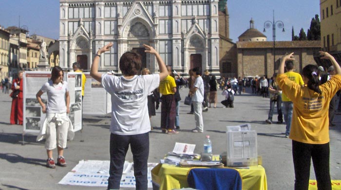 【明慧网二零零七年八月二十一日】二零零七年七月到八月,每个周六,意大利佛罗伦萨法轮功学员都在圣十字广场(Piazza S. Croce)和共和国广场(Piazza Repubblica)向路人,游客和当地民众讲述法轮大法真相和法轮功学员被中共活体摘取器官的惨烈事实。