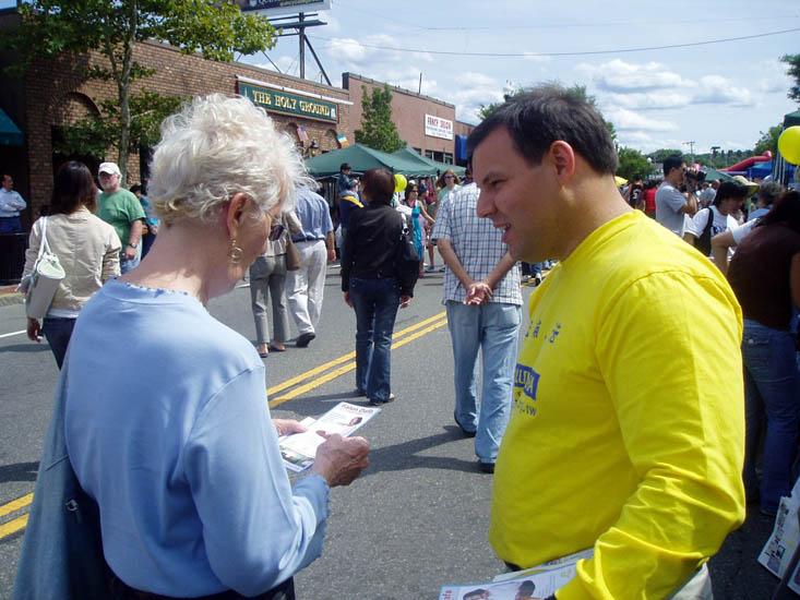 一位信基督教的西人女士走过来,接过真相资料,表示了她对大法的尊重,对魔难的认识,对现世纷乱的忧心以及对未来的憧憬。一位叫简娜(Jane)的高中教师来到摊位,邀请学员到学校的课堂上讲解法轮大法。还有更多的人索要法轮功教功带,表示要学功、炼功。