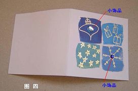 此外,在提篮桥监狱受迫害的法轮功学员还被奴役制作一些小手工品,有一种小卡片(图四),需要在指定位置贴二个小饰品。类似的还有一种卡片,要在指定的地方贴一个小五角星,五角星的背面有两个尖角,要被平弯90度后抹上粘胶,也没有什么工具,很多人的手都被扎破出血,一天下来,大拇指和食指手指肚都肿起来了。有时,特别是在中秋来临之前一个多月,会有要提月饼的一些纸的手提袋要做,炎炎的夏季,在闷热的监狱室内走廊上,受迫害中的法轮功学员们被逼迫赶制着各种手提袋。