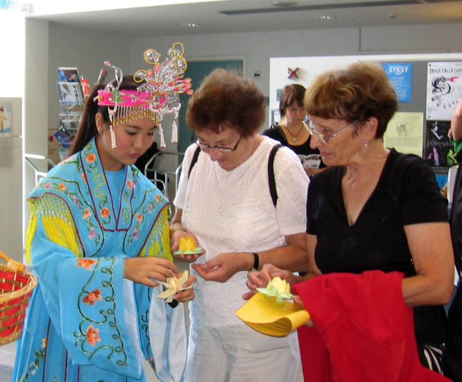 ![]() 法轮功学员给每位观众送了一朵自制的纸莲花,人们对圣洁、美丽的莲花赞不绝口。 |
