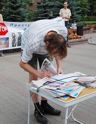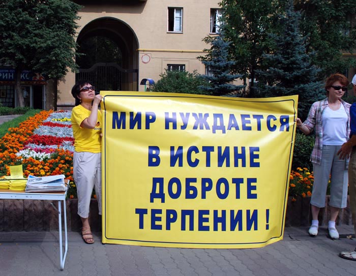 ![]() “立即停止(中共)对法轮功学员的迫害!(帮助)中共隐瞒罪行是对俄罗斯未来的威胁!”面对这样的横幅,两个年轻人想知道更多真相 |