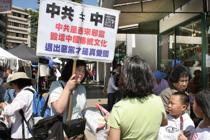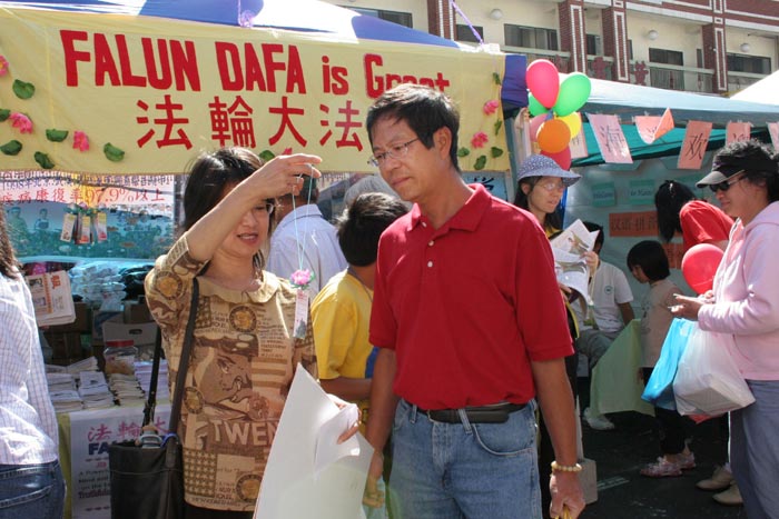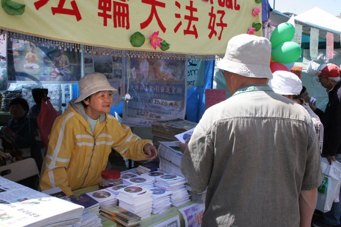 奥克兰市中国城这两天来人山人海,奥克兰街会是秋天中国人在本地的大型活动,有二百多摊位、吸引了二十万的人潮。两天来,许多旧金山湾区的法轮功学员参加了讲真相活动,在约十个街区的范围内发海外版的明慧周报、法轮功真相小册子、《九评共产党》等资料。