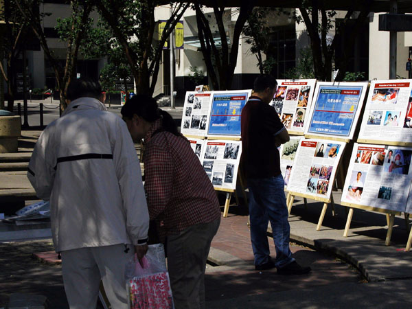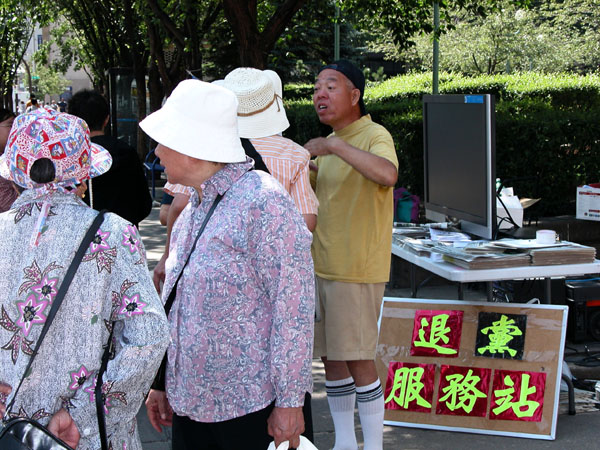 一位老太太仔细看完九评展板后,拉着一个退党义务工作人员的手就倾诉起来,因为她讲广东话,这个退党工作人员似懂非懂的听了个大致意思。后来,这个老太太只好离去。