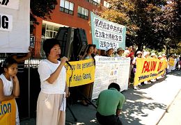 在集会上,多伦多法轮功学员代表爱丽丝(Alice)女士表示,由于中共政权用铺天盖地的谎言抹黑法轮功,残酷迫害修炼者,海外的法轮功学员为了揭露谎言,在有中共使领馆的地方,用展板、图片、横幅和小册子等向过往民众讲清真相。温哥华的法轮功学员,包括七、八十岁的老人和年青的上班族,轮流在当地中领馆前每天二十四小时的持续和平抗议,至今已坚持了六年。他们的和平祥和赢得了民众的理解、他们的锲而不舍受到人们的尊重和支援,不少人送来咖啡、饮料、鲜花甚至遮阳伞……。中领馆门前的法轮功真相图片展板,已成为一道亮丽的风景线,不少来自中国大陆的旅游团还特意经过这里了解真相。