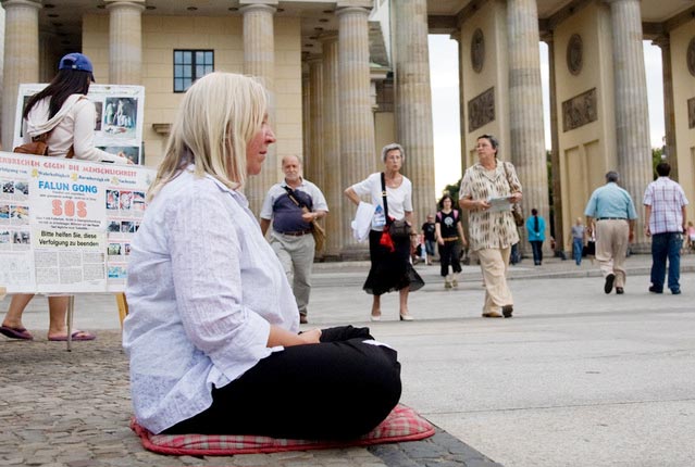 “中共对法轮功的迫害已持续了八年了,必须立刻被制止。”马里安娜•克洛兹巴赫(Marianne Klotzbach)说。这个个头不高的家庭主妇是柏林人,为了呼吁制止迫害,她已经在大街上与路人倾谈和派发资料几个小时了,脸庞在阳光和炎热的天气下显的红扑扑的。她还和其他柏林同修一起组织了在勃兰登堡门前的巴黎广场的静坐抗议活动。她说修炼法轮功已有九年了。六年多来她坚持每周两次在柏林中使馆对面的桥上炼功、派资料、讲真相,风雨无阻。“住在那儿周围的人都认识我了,他们一看到我就马上过来和我打招呼,绝大多数人都从我这儿了解了真相,清楚中国正在发生着什么。”每一番谈话她都引导听众更深入了解事实,曝光中共利用劳教所和精神病院对法轮功学员的迫害,从血腥残暴的酷刑、洗脑,滥用精神药物迫害,到非法活摘法轮功学员人体器官。