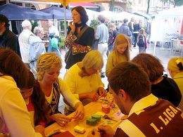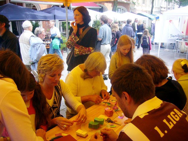 ![]() 人们饶有兴趣的学折纸莲花,并听法轮功学员讲真相 |
