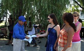 ![]() 法轮功学员向人们分发真相资料 |