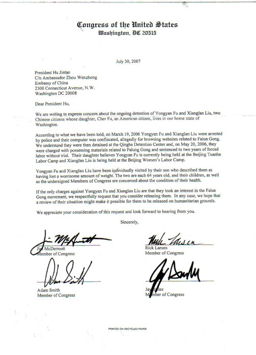 二零零七年七月三十日,四位华盛顿州的众议员 Jim McDermott, Rick Larsen, Adam Smith,Jay Inslee联名致信给中国国家主席主席胡锦涛及中国驻美国大使周文正要求释放付永安、刘香兰夫妇。