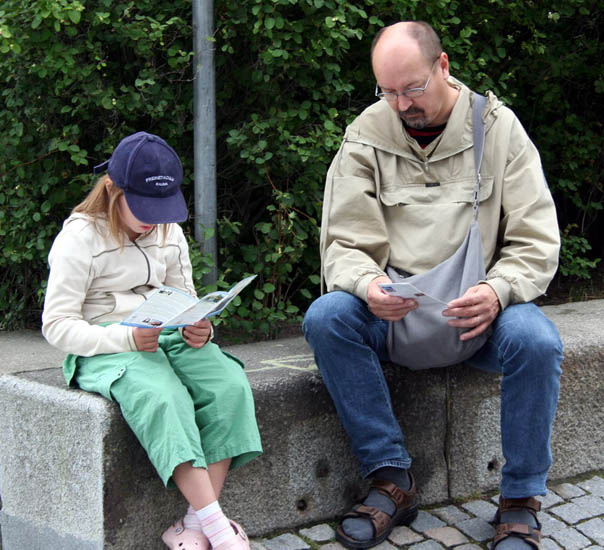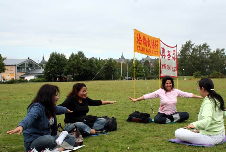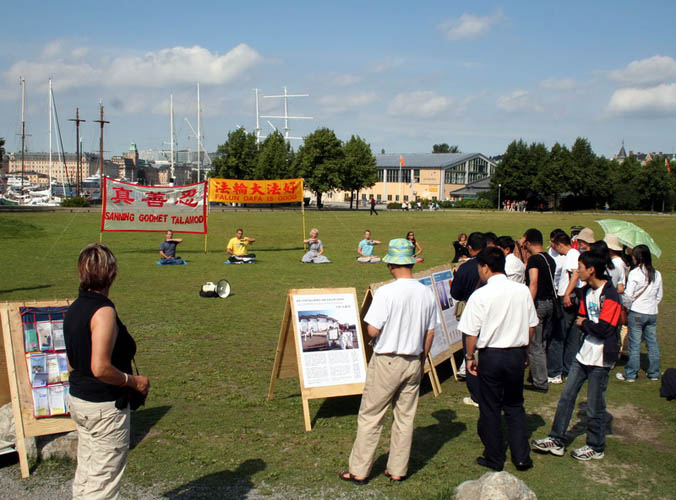 一位瑞典的导游看到这里有炼法轮功的非常的高兴,她说,她和女儿都想学,并详细的记下了炼功点的地址,还高声的对她的客人说,我们赶快抓紧时间参观,然后出来在这里看法轮功。