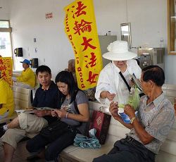 ![]() 纯朴的小镇居民接过法轮大法学员所发的传单,愉悦的了解真相 |